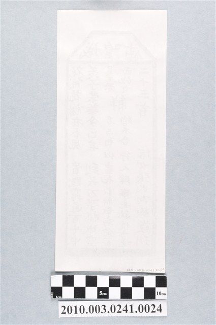 本件為木雕印版所印刷的宜蘭城隍廟第二十三首之籤詩,籤詩頭刻有「城隍庙」,下方詩句「花開花謝在春凨,貴賤窮通百□中;羨子榮華今已矣,到头万事搃成空。」以及籤詩序號、內容、歷史典故、諸事吉凶、捐獻者姓名。宜蘭城隍廟創立於嘉慶18年(1813),主祀神城隍爺。一套籤的數量有36、60、100、120等等,籤詩普遍涵蓋人生面相的正負解釋,藉由解籤人或求籤人的主客觀判斷,解惑尋求化解之道,是民眾的一種心理諮商管道。