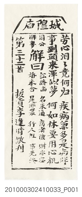 本件為木雕印版所印刷的宜蘭城隍廟第三十二首之籤詩,籤詩頭刻有「城隍庙」,下方詩句「劳心泪泪竟何归,疾病兼多是与非;事到頭來渾似夢,何如休要用心机。」以及籤詩序號、內容、歷史典故、諸事吉凶,由拔貢李逢時敬刊。宜蘭城隍廟創立於嘉慶18年(1813),主祀神城隍爺。一套籤的數量有36、60、100、120等等,籤詩普遍涵蓋人生面相的正負解釋,藉由解籤人或求籤人的主客觀判斷,解惑尋求化解之道,是民眾的一種心理諮商管道。