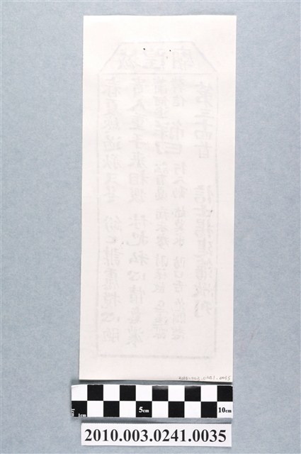 本件為木雕印版所印刷的宜蘭城隍廟第三十四首之籤詩,籤詩頭刻有「城隍廟」,下方詩句「春夏□□秋又冬,紛紛謀慮□心□;貴人重手來相援,休把私心情意濃。」以及籤詩序號、內容、歷史典故、諸事吉凶、捐獻者姓名。宜蘭城隍廟創立於嘉慶18年(1813),主祀神城隍爺。一套籤的數量有36、60、100、120等等,籤詩普遍涵蓋人生面相的正負解釋,藉由解籤人或求籤人的主客觀判斷,解惑尋求化解之道,是民眾的一種心理諮商管道。