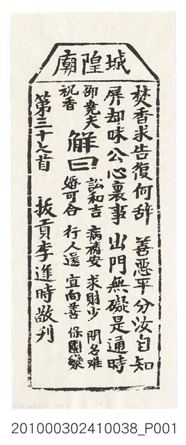本件為木雕印版所印刷的宜蘭城隍廟第三十七首之籤詩,籤詩頭刻有「城隍廟」,下方詩句「焚香求告復何辞,善惡平分汝自知;屏却昧公心裏事,出門無礙是通時。」以及籤詩序號、內容、歷史典故、諸事吉凶,由拔貢李逢時敬刊。宜蘭城隍廟創立於嘉慶18年(1813),主祀神城隍爺。一套籤的數量有36、60、100、120等等,籤詩普遍涵蓋人生面相的正負解釋,藉由解籤人或求籤人的主客觀判斷,解惑尋求化解之道,是民眾的一種心理諮商管道。
