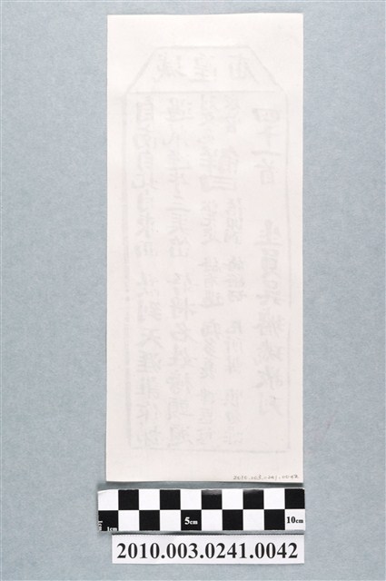 本件為木雕印版所印刷的宜蘭城隍廟第四十一首之籤詩,籤詩頭刻有「城隍庙」,下方詩句「自南自北自東西,□到天涯誰作梯;遇鼠逢牛三弄笛,好將名姓榜頭題。」以及籤詩序號、內容、歷史典故、諸事吉凶,由生員吳璿璣敬刊。宜蘭城隍廟創立於嘉慶18年(1813),主祀神城隍爺。一套籤的數量有36、60、100、120等等,籤詩普遍涵蓋人生面相的正負解釋,藉由解籤人或求籤人的主客觀判斷,解惑尋求化解之道,是民眾的一種心理諮商管道。