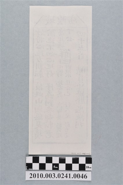 本件為木雕印版所印刷的宜蘭城隍廟第四十五首之籤詩,籤詩頭刻有「城隍庙」,下方詩句「好將心地力耕耘,彼此山頭縂是墳;陰地不如心地好,修為到底却輸君。」以及籤詩序號、內容、歷史典故、諸事吉凶,由職員藍籐忠敬刊。宜蘭城隍廟創立於嘉慶18年(1813),主祀神城隍爺。一套籤的數量有36、60、100、120等等,籤詩普遍涵蓋人生面相的正負解釋,藉由解籤人或求籤人的主客觀判斷,解惑尋求化解之道,是民眾的一種心理諮商管道。