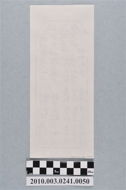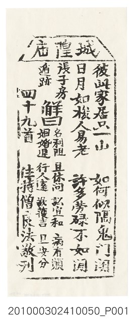 本件為木雕印版所印刷的宜蘭城隍廟第四十九首之籤詩,籤詩頭刻有「城隍庙」,下方詩句「彼此家居只一山,如何似隔鬼门関;日月如梭人易老,許多劳碌不如閒。」以及籤詩序號、內容、歷史典故、諸事吉凶、捐獻者姓名。宜蘭城隍廟創立於嘉慶18年(1813),主祀神城隍爺。一套籤的數量有36、60、100、120等等,籤詩普遍涵蓋人生面相的正負解釋,藉由解籤人或求籤人的主客觀判斷,解惑尋求化解之道,是民眾的一種心理諮商管道。