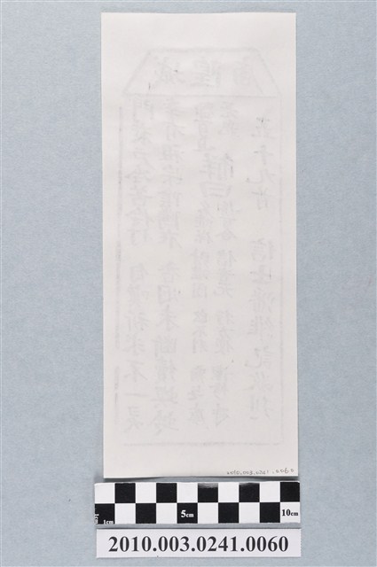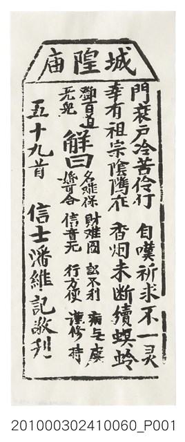 本件為木雕印版所印刷的宜蘭城隍廟第五十九首之籤詩,籤詩頭刻有「城隍庙」,下方詩句「門衰戶冷苦伶仃,自嘆祈求不一灵;幸有祖宗陰騭在,香烟未断續螟蛉。」以及籤詩序號、內容、歷史典故、諸事吉凶、捐獻者姓名。宜蘭城隍廟創立於嘉慶18年(1813),主祀神城隍爺。一套籤的數量有36、60、100、120等等,籤詩普遍涵蓋人生面相的正負解釋,藉由解籤人或求籤人的主客觀判斷,解惑尋求化解之道,是民眾的一種心理諮商管道。