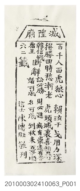 本件為木雕印版所印刷的宜蘭城隍廟第六二首之籤詩,籤詩頭刻有「城隍廟」,下方詩句「百千人面虎狼心,賴汝干戈用力深;得勝囬時秋漸老,虎頭城裏喜相寻。」以及籤詩序號、內容、歷史典故、諸事吉凶、捐獻者姓名。宜蘭城隍廟創立於嘉慶18年(1813),主祀神城隍爺。一套籤的數量有36、60、100、120等等,籤詩普遍涵蓋人生面相的正負解釋,藉由解籤人或求籤人的主客觀判斷,解惑尋求化解之道,是民眾的一種心理諮商管道。