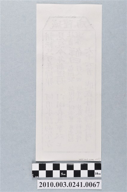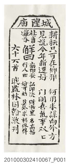 本件為木雕印版所印刷的宜蘭城隍廟第六十六首之籤詩,籤詩頭刻有「城隍庙」,下方詩句「耕耘只可在鄉邦,何用求謀向外方;見說今年新運好,门闌喜氣事双双。」以及籤詩序號、內容、歷史典故、諸事吉凶,由職監林國翰敬刊。宜蘭城隍廟創立於嘉慶18年(1813),主祀神城隍爺。一套籤的數量有36、60、100、120等等,籤詩普遍涵蓋人生面相的正負解釋,藉由解籤人或求籤人的主客觀判斷,解惑尋求化解之道,是民眾的一種心理諮商管道。