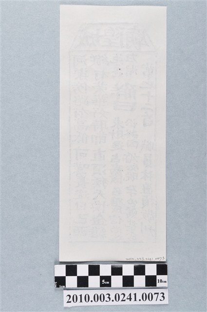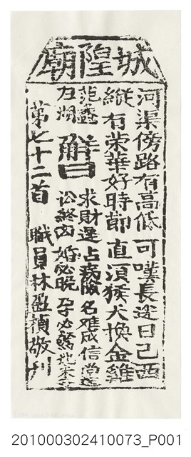 本件為木雕印版所印刷的宜蘭城隍廟第七十二首之籤詩,籤詩頭刻有「城隍廟」,下方詩句「河渠傍路有高低,可歎長途日己西;縱有荣華好時節,直須猴犬換金雞。」以及籤詩序號、內容、歷史典故、諸事吉凶,由職員林盈禎敬刊。宜蘭城隍廟創立於嘉慶18年(1813),主祀神城隍爺。一套籤的數量有36、60、100、120等等,籤詩普遍涵蓋人生面相的正負解釋,藉由解籤人或求籤人的主客觀判斷,解惑尋求化解之道,是民眾的一種心理諮商管道。