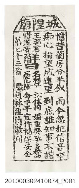 本件為木雕印版所印刷的宜蘭城隍廟第七十三首之籤詩,籤詩頭刻有「城隍廟」,下方詩句「憶昔蘭房分半釵,而今忽把信音乖;痴心指望成連里,到底誰知事不諧。」以及籤詩序號、內容、歷史典故、諸事吉凶,由職員林盈禎敬刊。宜蘭城隍廟創立於嘉慶18年(1813),主祀神城隍爺。一套籤的數量有36、60、100、120等等,籤詩普遍涵蓋人生面相的正負解釋,藉由解籤人或求籤人的主客觀判斷,解惑尋求化解之道,是民眾的一種心理諮商管道。