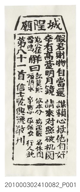 本件為木雕印版所印刷的宜蘭城隍廟第八十一首之籤詩,籤詩頭刻有「城隍廟」,下方詩句「假君財物自當還,謀賴心欺他自奸;幸有高臺明月鏡,請來对照破機關。」以及籤詩序號、內容、歷史典故、諸事吉凶、捐獻者姓名。宜蘭城隍廟創立於嘉慶18年(1813),主祀神城隍爺。一套籤的數量有36、60、100、120等等,籤詩普遍涵蓋人生面相的正負解釋,藉由解籤人或求籤人的主客觀判斷,解惑尋求化解之道,是民眾的一種心理諮商管道。