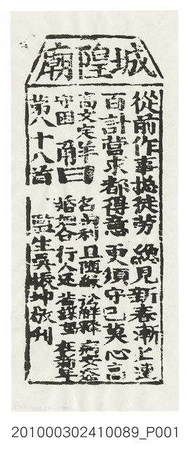 本件為木雕印版所印刷的宜蘭城隍廟第八十八首之籤詩,籤詩頭刻有「城隍廟」,下方詩句「從前作事搃徒勞,纔見新春漸上遭;百計营求都得意,更須守己莫心高。」以及籤詩序號、內容、歷史典故、諸事吉凶,由監生吳振坤敬刊。宜蘭城隍廟創立於嘉慶18年(1813),主祀神城隍爺。一套籤的數量有36、60、100、120等等,籤詩普遍涵蓋人生面相的正負解釋,藉由解籤人或求籤人的主客觀判斷,解惑尋求化解之道,是民眾的一種心理諮商管道。