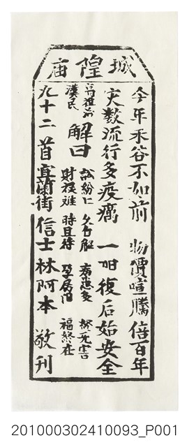 本件為木雕印版所印刷的宜蘭城隍廟第九十二首之籤詩,籤詩頭刻有「城隍庙」,下方詩句「今年禾谷不如前,物價喧騰倍百年;灾數流行多疫癘,一□復后始安全。」以及籤詩序號、內容、歷史典故、諸事吉凶、捐獻者姓名。宜蘭城隍廟創立於嘉慶18年(1813),主祀神城隍爺。一套籤的數量有36、60、100、120等等,籤詩普遍涵蓋人生面相的正負解釋,藉由解籤人或求籤人的主客觀判斷,解惑尋求化解之道,是民眾的一種心理諮商管道。