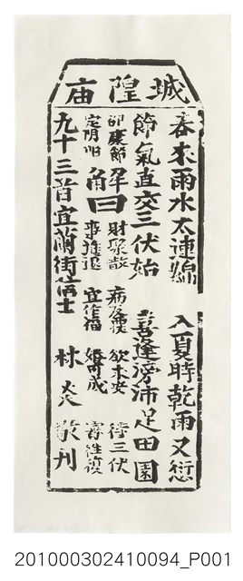 本件為木雕印版所印刷的宜蘭城隍廟第九十三首之籤詩,籤詩頭刻有「城隍庙」,下方詩句「春來雨水太連綿,入夏時乾雨又愆;節氣直交三伏始,喜逢滂沛足田園。」以及籤詩序號、內容、歷史典故、諸事吉凶、捐獻者姓名。宜蘭城隍廟創立於嘉慶18年(1813),主祀神城隍爺。一套籤的數量有36、60、100、120等等,籤詩普遍涵蓋人生面相的正負解釋,藉由解籤人或求籤人的主客觀判斷,解惑尋求化解之道,是民眾的一種心理諮商管道。