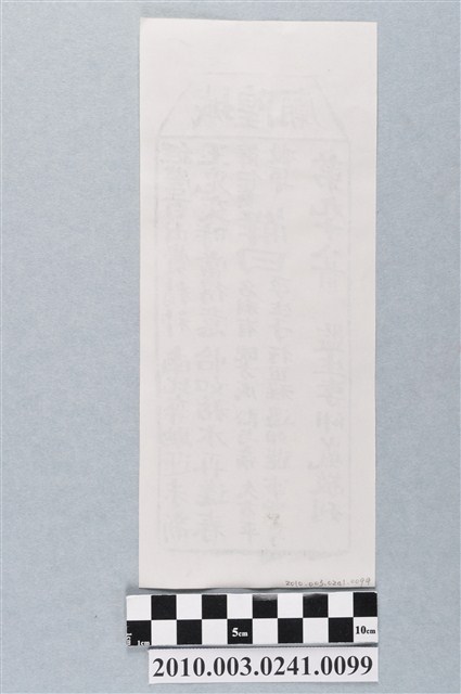 本件為木雕印版所印刷的宜蘭城隍廟第九十八首之籤詩,籤詩頭刻有「城隍廟」,下方詩句「經營百出費精神,南北奔馳運未新;玉兔交時當得意,恰如枯木再逢春。」以及籤詩序號、內容、歷史典故、諸事吉凶,由監生李仰嵐敬刊。宜蘭城隍廟創立於嘉慶18年(1813),主祀神城隍爺。一套籤的數量有36、60、100、120等等,籤詩普遍涵蓋人生面相的正負解釋,藉由解籤人或求籤人的主客觀判斷,解惑尋求化解之道,是民眾的一種心理諮商管道。