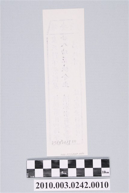 本件為木雕印版所印刷的宜蘭五結鎮安廟第玖首籤詩,籤詩頭刻有「鎮安廟」,下方有籤詩序號第玖首,內容「皇天降下紫微星,奸賊翦除四海寧;廿八功臣扶令主,漢家宗廟再威靈。」由監生楊世彰敬刊。鎮安廟又稱二結王公廟,奉祀古公三王(柳、葉、英姓三位),1997年進行「千人移廟」所著名。一套籤的數量有36、60、100、120等等,籤詩普遍涵蓋人生面相的正負解釋,藉由解籤人或求籤人的主客觀判斷,解惑尋求化解之道,是民眾的一種心理諮商管道。