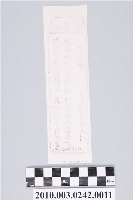 本件為木雕印版所印刷的宜蘭五結鎮安廟第拾首籤詩,籤詩頭刻有「鎮安廟」,下方有籤詩序號第拾首,內容「根深葉落望拙芽,萬一逢春自放華;雖是中間多阻滯,運來到底屬吾家。」由監生楊世彰敬刊。鎮安廟又稱二結王公廟,奉祀古公三王(柳、葉、英姓三位),1997年進行「千人移廟」所著名。一套籤的數量有36、60、100、120等等,籤詩普遍涵蓋人生面相的正負解釋,藉由解籤人或求籤人的主客觀判斷,解惑尋求化解之道,是民眾的一種心理諮商管道。