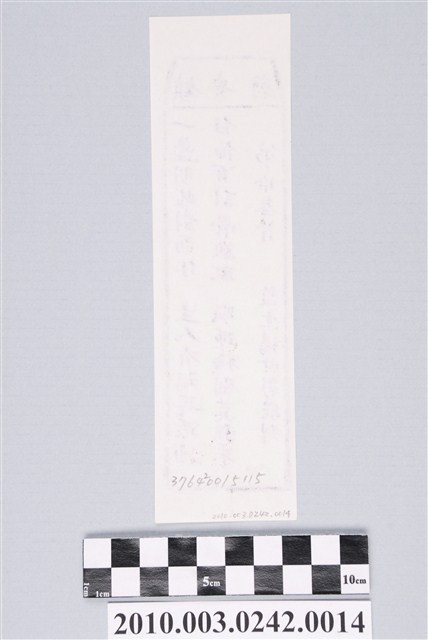 本件為木雕印版所印刷的宜蘭五結鎮安廟第拾叁首籤詩,籤詩頭刻有「鎮安廟」,下方有籤詩序號第拾叁首,內容「一盞明燈對面休,主人有福再添油;任他百計營難就,順逆機關莫強求。」由監生楊世彰敬刊。鎮安廟又稱二結王公廟,奉祀古公三王(柳、葉、英姓三位),1997年進行「千人移廟」所著名。一套籤的數量有36、60、100、120等等,籤詩普遍涵蓋人生面相的正負解釋,藉由解籤人或求籤人的主客觀判斷,解惑尋求化解之道,是民眾的一種心理諮商管道。