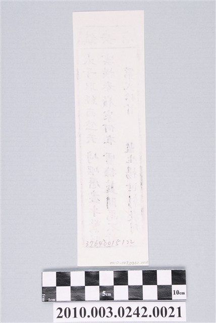 本件為木雕印版所印刷的宜蘭五結鎮安廟第弍拾首籤詩,籤詩頭刻有「鎮安廟」,下方有籤詩序號第弍拾首,內容「太子取經西竺天,崎嶇歷盡半驚眠;雲橫秦嶺家何在,雲擁藍關馬不前。」由監生楊世彰敬刊。鎮安廟又稱二結王公廟,奉祀古公三王(柳、葉、英姓三位),1997年進行「千人移廟」所著名。一套籤的數量有36、60、100、120等等,籤詩普遍涵蓋人生面相的正負解釋,藉由解籤人或求籤人的主客觀判斷,解惑尋求化解之道,是民眾的一種心理諮商管道。