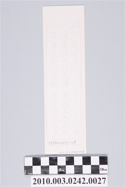 本件為木雕印版所印刷的宜蘭五結鎮安廟第弍陸首籤詩,籤詩頭刻有「鎮安廟」,下方有籤詩序號第弍陸首,內容「伏羲畵卦創常經,甲子推遷列五星;暗裏虧心終不敢,舉頭三尺有神靈。」由生員林延祚敬刊。鎮安廟又稱二結王公廟,奉祀古公三王(柳、葉、英姓三位),1997年進行「千人移廟」所著名。一套籤的數量有36、60、100、120等等,籤詩普遍涵蓋人生面相的正負解釋,藉由解籤人或求籤人的主客觀判斷,解惑尋求化解之道,是民眾的一種心理諮商管道。