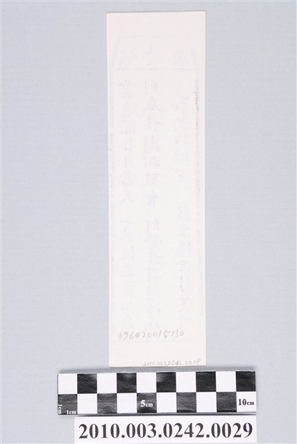 本件為木雕印版所印刷的宜蘭五結鎮安廟第弍拾捌首籤詩,籤詩頭刻有「鎮安廟」,下方有籤詩序號第弍拾捌首,內容「雲遮深谷月當天,一味徒思亦渺然;到底佳期相聚會,何勞君爾問神仙。」由監生楊世彰敬刊。鎮安廟又稱二結王公廟,奉祀古公三王(柳、葉、英姓三位),1997年進行「千人移廟」所著名。一套籤的數量有36、60、100、120等等,籤詩普遍涵蓋人生面相的正負解釋,藉由解籤人或求籤人的主客觀判斷,解惑尋求化解之道,是民眾的一種心理諮商管道。