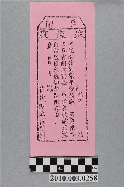 2010.003.0258 宜蘭城隍廟木刻版印恭請神像回家空白借據