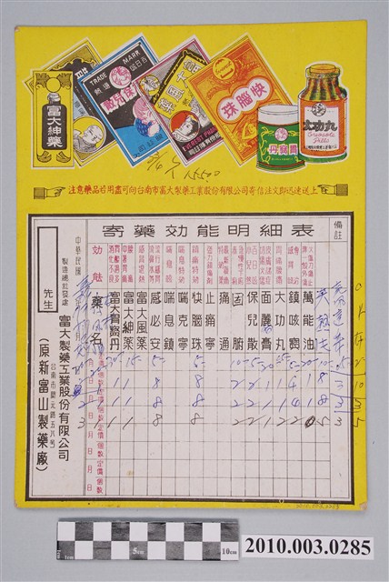 1.此件為富大製藥工業股份有限公司(原新富山製藥廠)寄藥時的藥品訂購表,彩色印刷卡紙製,封面中央以關公手握青龍偃月寶刀騎著馬於富士山頂為主要圖案,正上方有著「家庭常備平安錦囊」標語、再下來則為「努力生產 實行節約」之宣傳口號,兩側印有「臺灣省政府認可 內外諸大醫方劑」;背面上方是銷售不錯之富大紳藥、保兒散、富大風藥、快腦珠、胃寶丹與大功丸,下方印有寄藥效能明細表,列出各藥品效能、藥名、日期、定價及個數,其中如萬能油、鎮咳寶、止痛寧、富大胃寶丹等,中央甚至提醒若藥品用盡,寄信到藥廠,將立即送上。