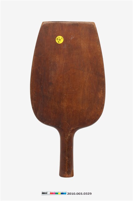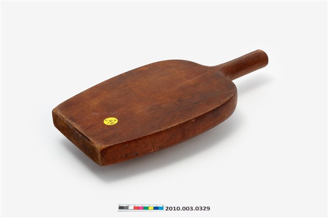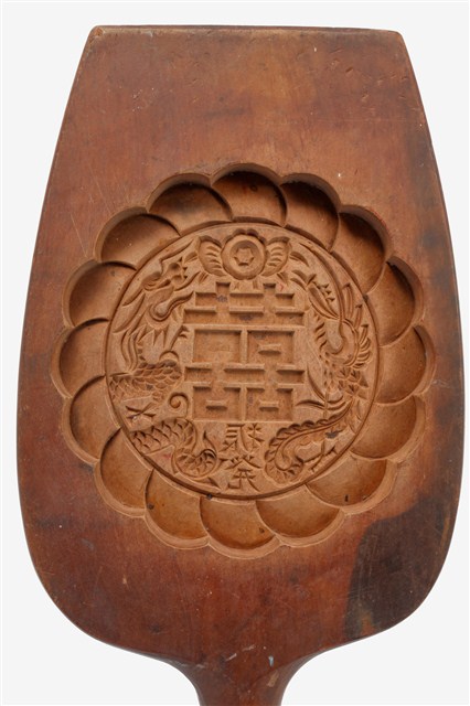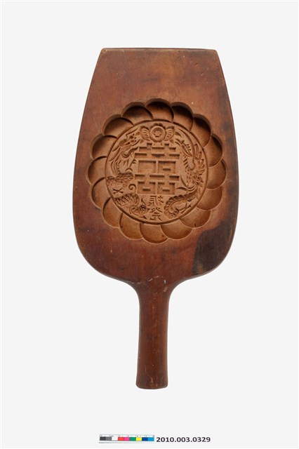2010.003.0329 酒瓶形單面雕龍鳳囍字紋有柄餅印