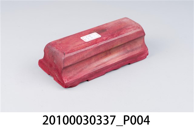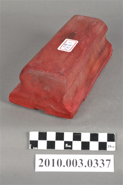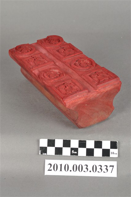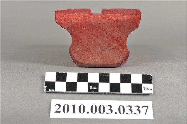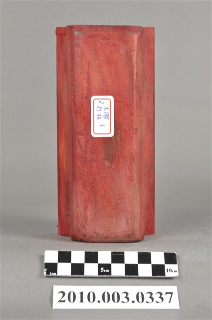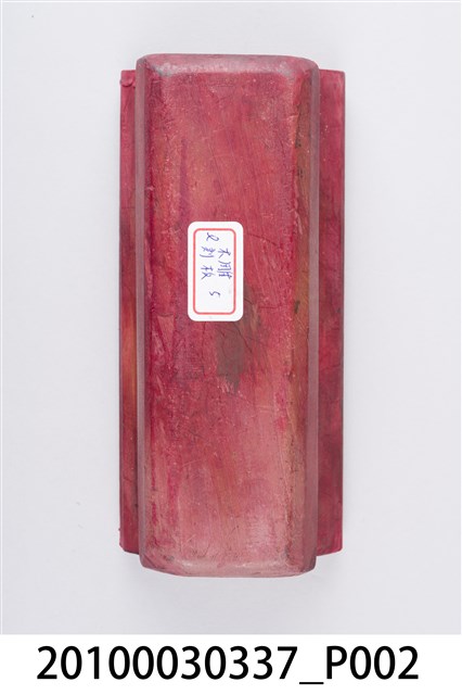 金銀紙在製造時乃先由大捲紙進行平版面的印製,之後再加以裁切,在裁妥各類金銀紙之後,再打上金銀紙側邊的印記。本件為金銀紙的邊印,在印記上方還刻意刻造出直條凸起,方便拿握打印。