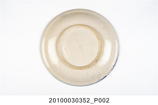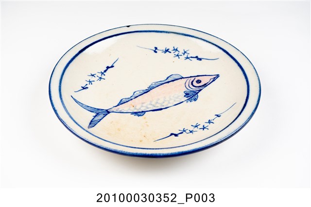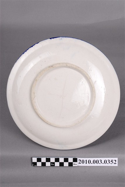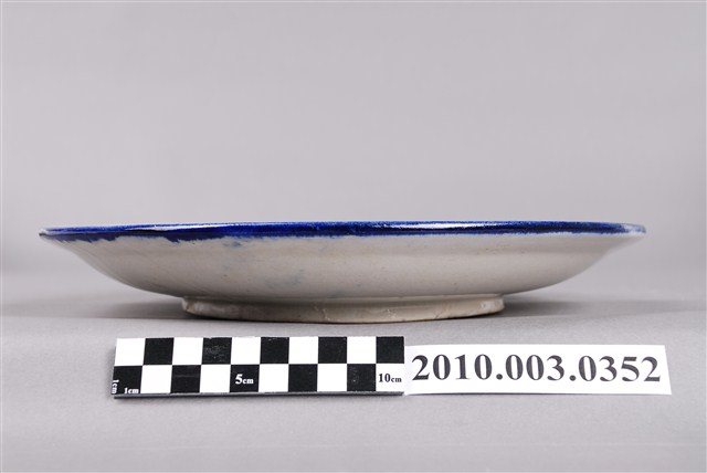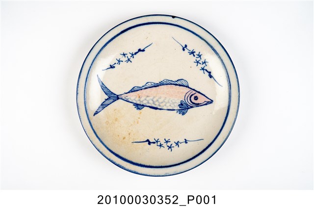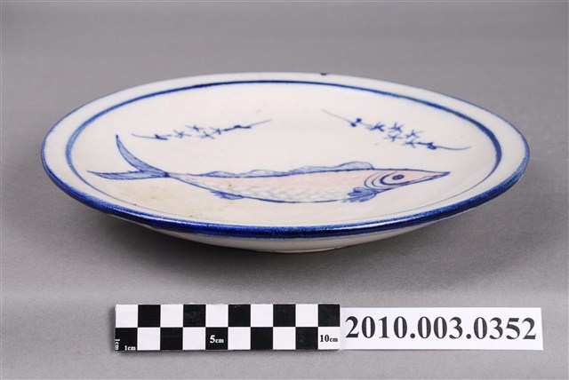手繪粉紅釉鯉魚紋圓盤圓唇,口沿外侈且略不平整,窄折沿,寬圓腹,弧壁下收至圈足,矮圈足,圈足徑較大,平底露胎,胎色淨白,胎質略細。全器施化妝土後滿施透明釉,釉面呈色白皙且略帶黃,器表有些許因高溫燒導致的氣孔,器表有一些開片痕跡。外壁素面無紋,但有些許較淺的鈷藍釉料沾染。紋飾集中於盤面;口緣施罩一圈鈷藍釉,青花發色濃重,折沿處再以青花繪一弦紋,呈色較為不均勻且釉色有發散的現象。主要紋飾繪於盤心,以青花勾勒鯉魚的輪廓,再以粉紅釉於魚身內填彩,粉紅釉發色淺淡柔和。魚身以留白、青花勾勒等兩種方式表現魚鱗。魚身周圍以鈷藍釉繪線條,結組成水草一類紋樣,增添構圖變化性。