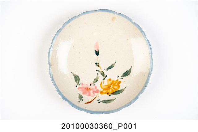 手繪粉紅釉花卉紋花口小碟為高溫燒製且由模具成形,圓唇,外侈,口沿作花口狀,深圓腹,弧壁下收至圈足,圈足徑適中,平底刮釉露胎,胎色白中帶黃,胎質較粗。全器滿施白釉,釉面呈色偏黃,暖白潤澤,器表有雜質色素沈澱,且多有凹凸不平之處。外壁素面無紋,紋飾集中於盤面:口緣處施罩一圈鈷藍釉裝飾,青花發色淺薄,呈色均勻。主要紋飾繪於盤心一側,以粉紅釉、黃釉為主要色調,描繪兩朵盛放的花卉,以及含苞待放的粉色花苞,並以黛綠釉於四周點綴草葉紋飾,花卉綻放的效果,增添整體紋飾的色彩變化。