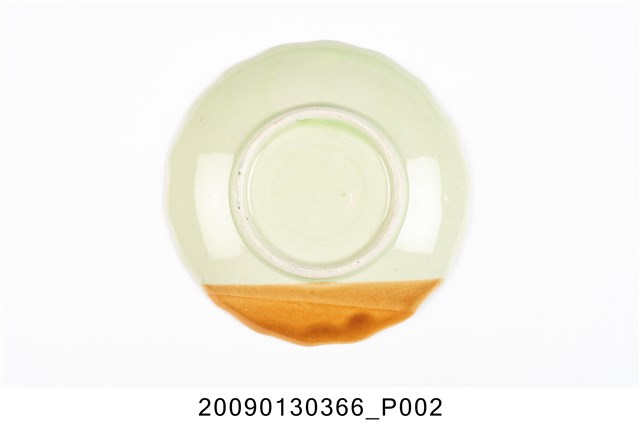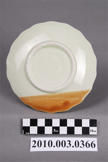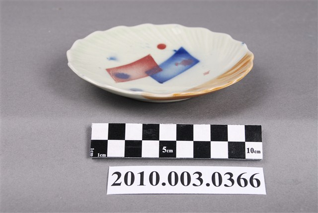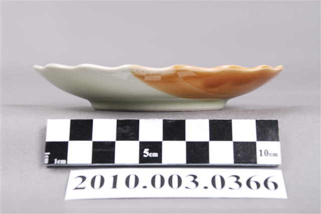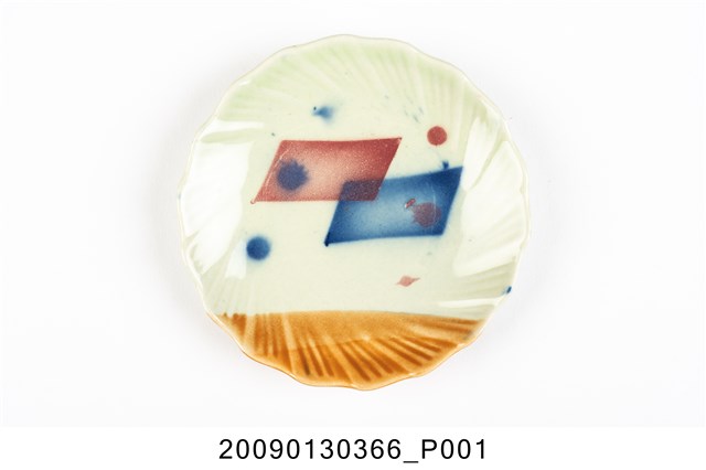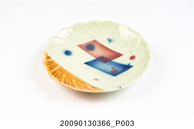 噴繪醬釉幾何紋花口碟為高溫燒製且由模具成形,圓唇,外侈,口沿作花口狀且略不平整,淺圓腹,弧壁下收至圈足,圈足徑適中,平底刮釉露胎,胎色白中帶黃,胎質略細。全器滿施白釉,釉面呈色白皙潤澤,器表略有雜質沈澱與氣孔。外壁素面無紋,紋飾集中於盤心。口緣處壓印成花瓣狀的紋路,盤面有如俯瞰盛開花朵一般。盤子一側以浸染的方式上褐色釉,盤心處則以噴繪的方式繪交疊的平行四邊形與圓點。紋飾以鈷藍釉及粉紅色釉繪成。浸染醬釉是民間用詞常見的裝飾手法,而粉紅色釉搭配鈷藍釉亦是民間用瓷的主要使用色彩。