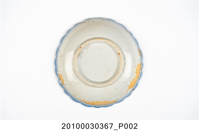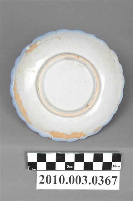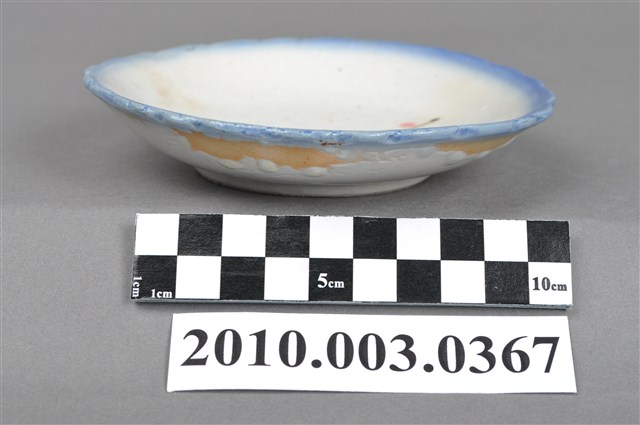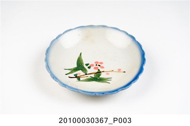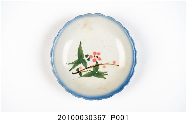 手繪粉紅釉花卉紋花口小碟為高溫燒製且由模具成形,圓唇,外侈,口沿作花口狀且略不平整,深圓腹,弧壁下收至圈足,圈足徑適中,平底刮釉露胎,胎色白中帶黃,胎質較粗。全器滿施白釉,釉面呈色白皙潤澤,器表有雜質色素沈澱,且多有凹凸不平之處。外壁素面無紋,口沿處有較嚴重的縮釉現象。紋飾集中於盤面:口緣處施罩一圈鈷藍釉裝飾,青花發色淺薄,呈色略有不均。主要紋飾繪於盤心一側,以粉紅釉、黛綠釉為主要色調,先以褐色釉勾出枝枒,再點上粉色的花卉,襯托花朵的草葉紋,花卉綻放的效果及色調,增添整體紋飾的色彩變化。