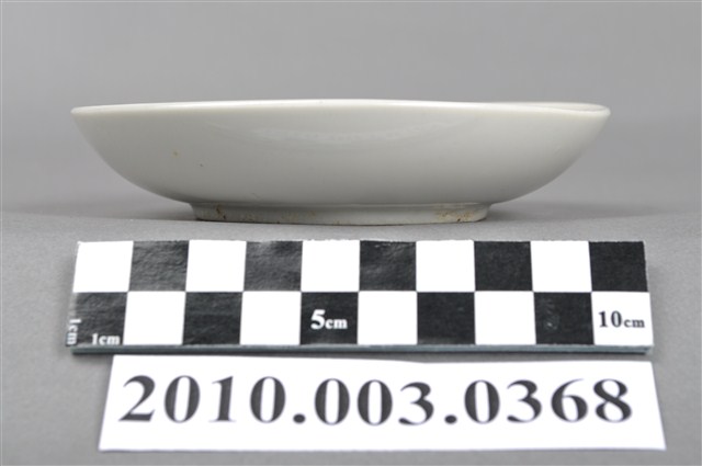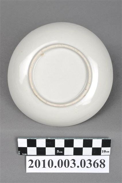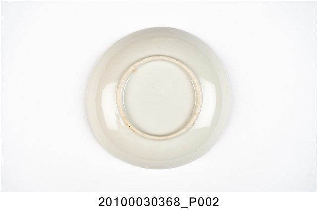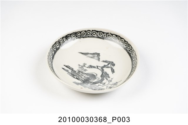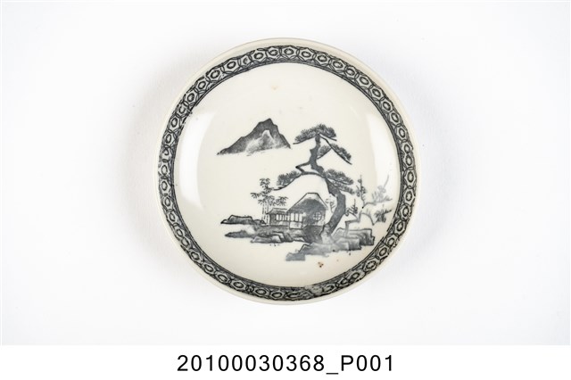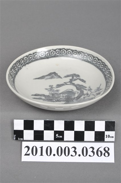 印花釉下彩松樹人家圖圓碟圓唇,外侈,口沿不平整,寬圓腹,略深,弧壁下收至圈足,矮圈足,圈足徑略大,約為口徑之一半,平底刮釉露胎,無款識。全器施以透明釉後高溫燒製,再以黑色釉轉印紋樣裝飾,黑色釉發色均勻,呈色帶灰。全器釉面略有針孔與斑點,圈足周圍有釉料脫落痕跡。碟外壁素面無紋,主要紋飾會於碟面。口緣處轉印幾何紋帶狀紋飾。盤心為主紋飾,為典型中國傳統風格的山水畫,以對角構圖為主。近景為岸上的建築與一顆高大的松樹為主體,並以竹子點綴;遠景則為層疊山頭。紋飾皆有明顯輪廓線勾勒,再以同色釉料填彩。整體紋飾布排規整,構圖簡潔層次分明。