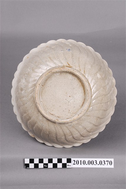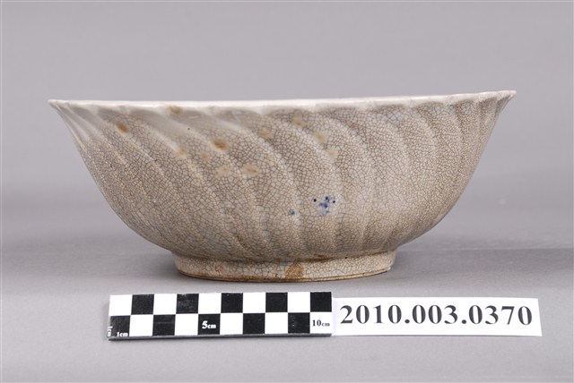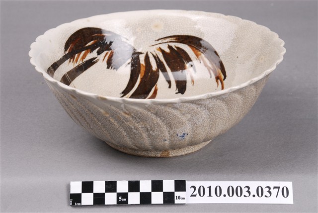1.手繪白瓷南洋景緻花形碗為高溫燒製,並以模具成形。圓唇,敞口,弧壁,圓腹,碗底深且寬,大圈足,圈足露胎,胎色較白,胎質細膩。全器施白釉,呈色較淡且帶黃色調,整體色澤偏暖瑩潤,器表內、外滿佈細小開片。口沿作向外開展、波浪般的花口狀,碗外壁素面無紋,僅以模具印出長條波浪狀的花瓣稜脊,使得整件作品彷彿一朵綻放地恰到好處的花朵。主要紋飾為繪於碗內的南洋風光景色,以左側兩大株椰子樹為主角,再以水面、漁船、遠山等增添構圖的裝飾以及飽滿度。整體紋飾主要以深褐色釉、藍釉、黃釉等釉彩繪成,用筆大氣灑脫,構圖活潑不單調。2.南洋景緻的裝飾紋樣在日據末期以及光復初年十分流行,反映當代社會背景以及對於南洋拓殖的嚮往心情,十分具有臺灣的歷史時代特色。