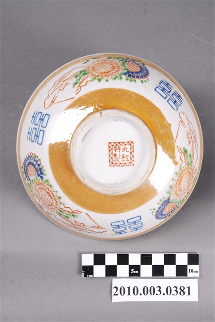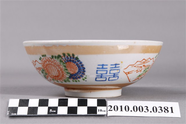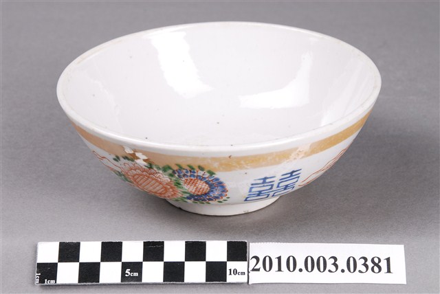 轉印白瓷彩釉囍字碗薄唇,平口,弧壁,圓腹下斂至圈足,圈足徑較小,小於口徑的一半,圈足露胎,胎色潔白,胎質細緻。全器施白釉,呈色較白,色澤光潔瑩潤,器表略有因燒製導致的氣孔以及縮釉痕跡。碗內光滑無紋飾,僅在外壁做裝飾。外壁近口部以及圈足周圍轉印一黃釉帶狀紋飾,釉色略顯不均。器腹間則以兩組紋飾相間而成,一為藍釉雙喜字樣,另一組為太陽花、飛翔的鶴紋組成的大片紋飾,主要以紅釉勾勒輪廓,再以鈷藍、綠釉填彩。圈足內有一方形雙框款識,內書「丸紅特製」款。