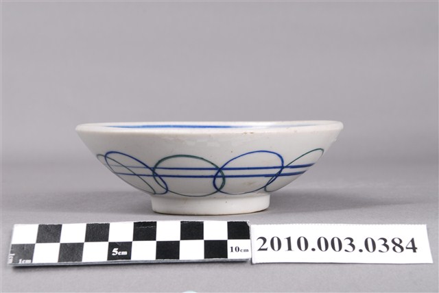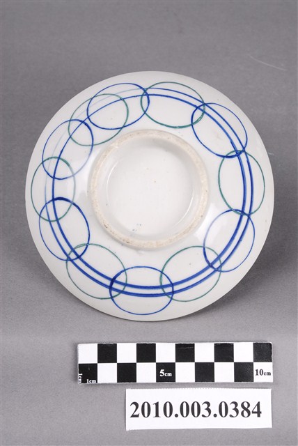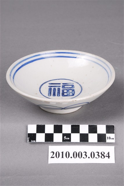 印花青花圈紋福字碗圓唇,敞口,淺腹,斜壁下斂至圈足,圈足徑適中,約等於口徑的一半,圈足露胎,胎色白皙,胎質細膩。全器施白釉,呈色較潔白,色澤瑩潤,但器表有因燒製導致的些許氣孔,略有不平。紋飾皆以鈷藍釉繪成,呈色飽和。外壁中央繪兩條弦紋,粗細略不均,再以轉印的方式繪製數個圈狀紋樣,以線條的變化作裝飾趣味。碗內在近口沿處繪較粗的雙弦紋,碗心處則有一圈紋,內印一「福」字,字形寬、圓,具裝飾性。整體的紋樣由線條的粗細可見橡皮雕刻的模板因為吃釉不均導致明顯的轉印痕跡。