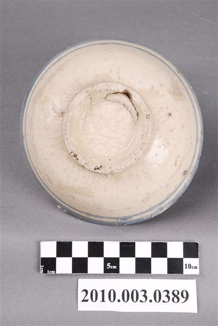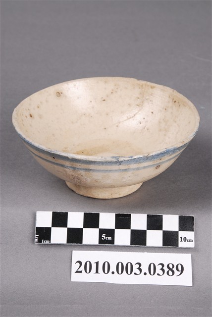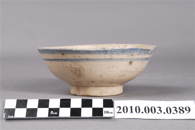 手繪白瓷青花弦紋碗薄唇,平口,口沿不平整,圓淺腹,弧壁下斂至圈足,圈足徑適中,約為口徑一半大小,圈足直壁且略高,圈足露胎,胎色白皙,胎質略粗糙,圈足處稍有窯沙沾黏以及脫釉痕跡。全器厚胎,器表有許多氣孔以及雜質沾黏,碗心有相疊入窯燒製導致而成的澀圈痕跡。全器施白釉,呈色略帶黃,微微透出光澤感。全器僅外壁以鈷藍釉裝飾,青花發色較淡且不均,於口沿處繪一粗一細的兩圈圈紋。內壁光潔無紋飾。