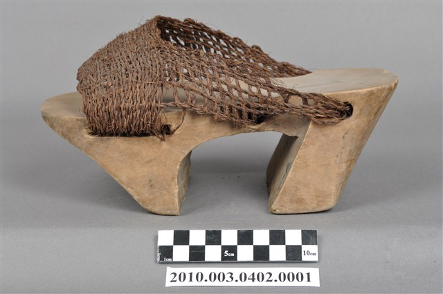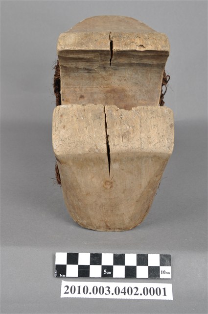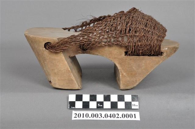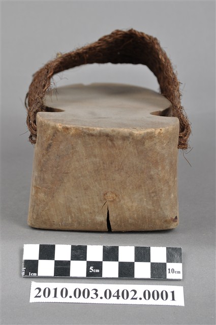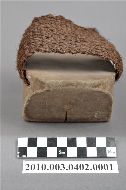木屐通常由三部分組成:一是底板,通常以木料為之,作鞋底形,此木屐是以木頭原色鑿砍做鞋底材質;二是繩帶,被稱之為「系」,就指屐上的繩帶,此木屐繩帶的部分,不是簡單的繩帶而是用棕色的草木纖維編織而成鞋面;三是屐齒,就是底板下以刨刀將中間的木材削掉,形成鞋頭底較低,鞋跟處較高的屐齒。此木屐由棕色草編成拖鞋鞋面形狀,延伸兩條繩帶穿到後面的屐齒上,整體型態簡潔而瀟灑。臺灣知名的服裝設計師洪麗芬,喜歡用湘雲紗來製作服裝,同時使用類似的木屐來搭配展示的服裝,呈現出飄逸無羈的浪漫風格。