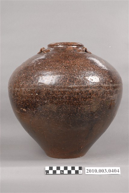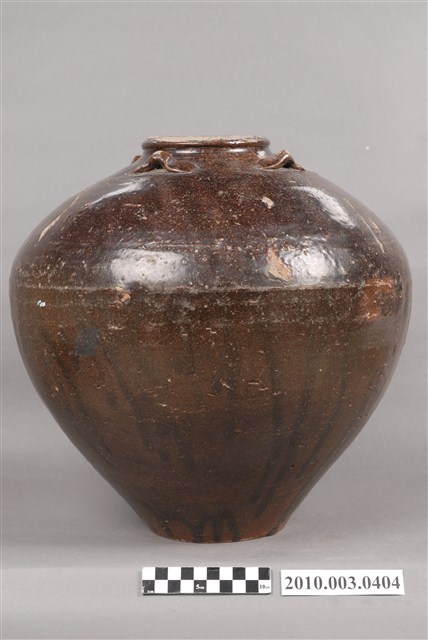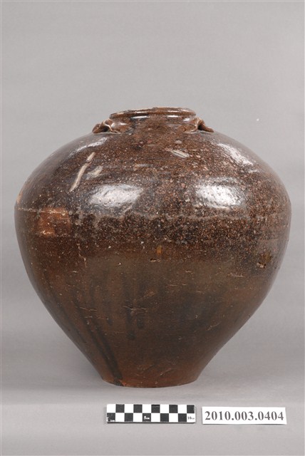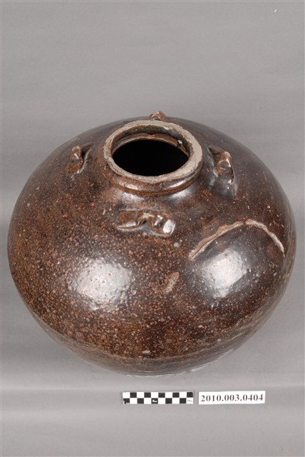 1.黑褐釉四繫大陶罐,陶罐外型圓胖,小唇口,斜弧肩,最大腹徑在肩腹之間,以下弧度內收成平底微內凹,底徑約與口徑大小相近,緊貼頸肩處對稱裝飾4只橫繫,器身施釉不均,腹部以下有流釉現象,口緣局部未施釉,釉面斑點為燒製時造成。2.本件為漢式陶壺非原住民自製亦非原住民樣式,中國福建窯場製造,根據捐贈者提供資料,於宜蘭社頭地區採集之平埔原住民陶罐。社頭位於現今宜蘭縣壯圍鄉,為噶瑪蘭族居住地,本件可能為該族或該地之漢人使用,或有可能因外來文化影響又因便利取得,使得噶瑪蘭族或其他族群逐漸捨棄使用需耗時製作的陶罐,因而