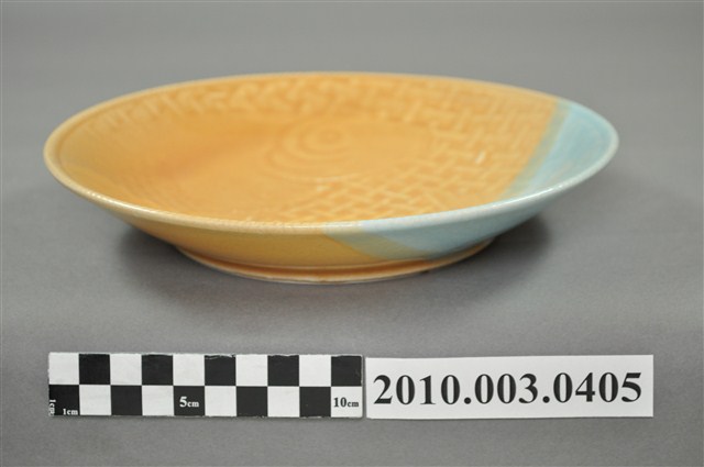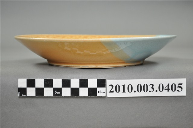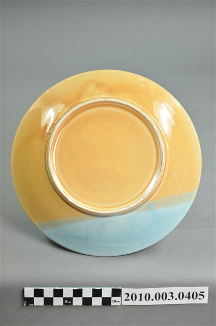 1.本件黃釉劃花魚紋盤,是北投地區產製的日用陶瓷器皿。敞口,弧腹,平底,寬圈足。圈足刮釉露胎,胎質細密堅硬,胎色潔白。除圈足外通體施釉,全器約有三分之二施黃釉,三分之一施天青釉,施釉痕跡明顯,圈足周圍亦可見積釉及縮釉現象。釉面富光澤,並可見細微開片紋。盤面刻畫花紋作裝飾,口沿壓印斜向篦劃紋作花邊,盤內黃釉部分刻劃魚紋,魚紋周邊仿籐編紋樣滿劃十字紋裝飾,整體設計頗具巧思。