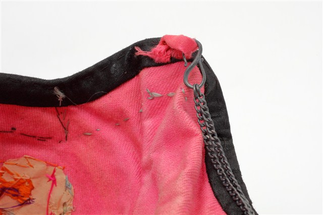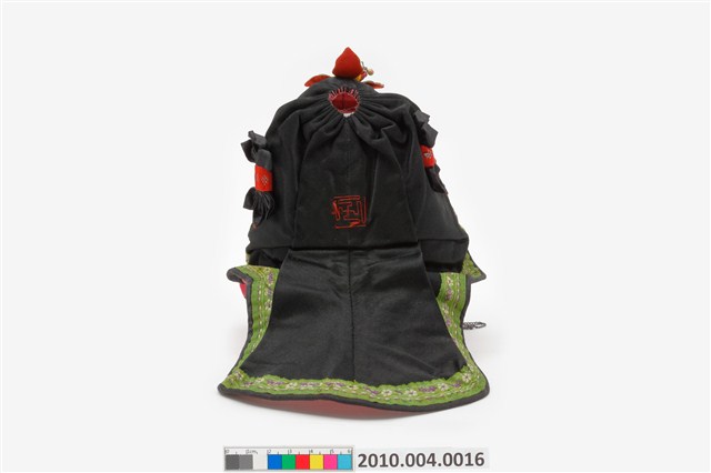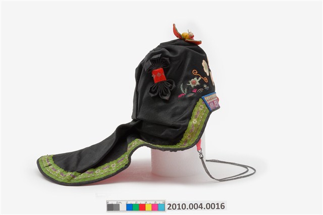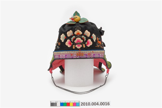 2010.004.0016 黑綢地柿球頂彩繡牡丹風帽