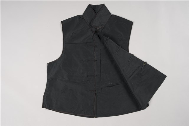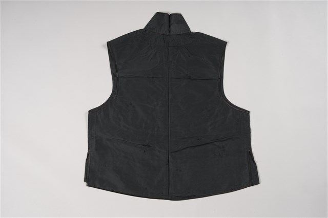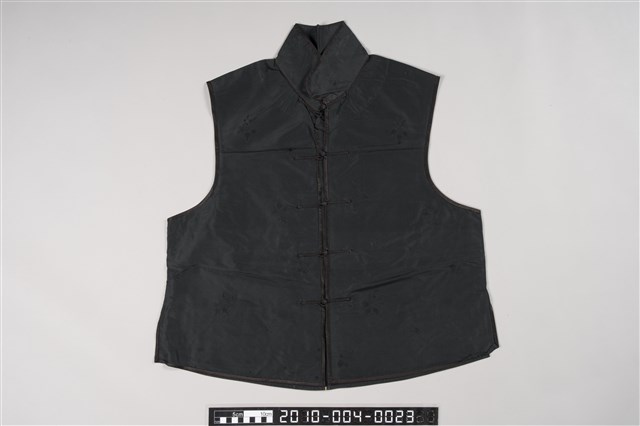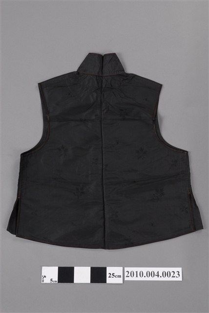 1.此件背心為單層結構,表布為黑色絲質緹花緞布,緹花紋飾為小花葉暗紋,領緣、對襟、袖襱、開衩和下襬用深棕色面料鑲緄,頷下和對襟綴縫五對直布釦,使用的是與鑲緄配布相同的深棕色面料,使整體衣飾輪廓更加凸顯,沉著內斂的色彩更顯得不張揚穩重。立領部分的製作,是先以緞布鑲緄領緣後,再將立領綴縫上去,此種製作方法是方便日後衣領可以拆卸置換。2.此種無袖上衣,清代稱為坎肩,南方稱為馬甲,在台灣則稱之為褂袷(甲,衣旁)。穿著方法與馬褂類似,罩穿於長袍(衫)之外,晚清民國時期坎肩男女之別主要在於用色和紋飾;另外,女式坎肩有長遮過臀及膝者,被稱為長馬甲,男子則無長馬甲,男子坎肩大都短而合身,清代男子坎肩開襟、鑲緄紋飾多樣較繁複,民國之後男坎肩造型則多素雅、穩定而少紋飾。