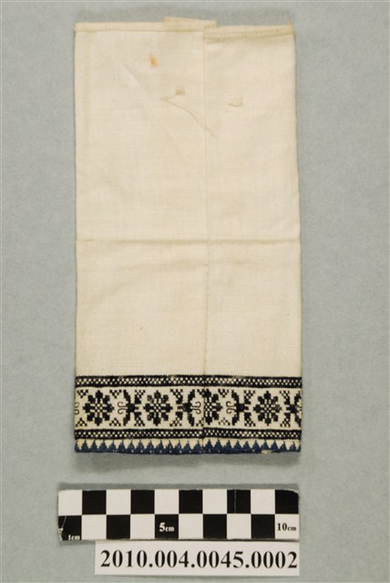此飾褲為單層結構,以白色棉料做基底,下端以黑色絲線做數紗和十字刺繡,圖紋有連續的菱形、八字紋、八角花、蝴蝶等圖案,褲口以藍色絲線做三角結邊繡收邊。「數紗」刺繡技法是指刺繡時,要以數布料紗線格子的方式,在紗格之間以平針方式刺繡圖案,與「戳紗」技法類似;「十字挑花」則是利用平紋組織布料、經緯紗交織的十字紋格眼下針,繡線十字交叉使之形成圖案,簡稱為「十字繡」。