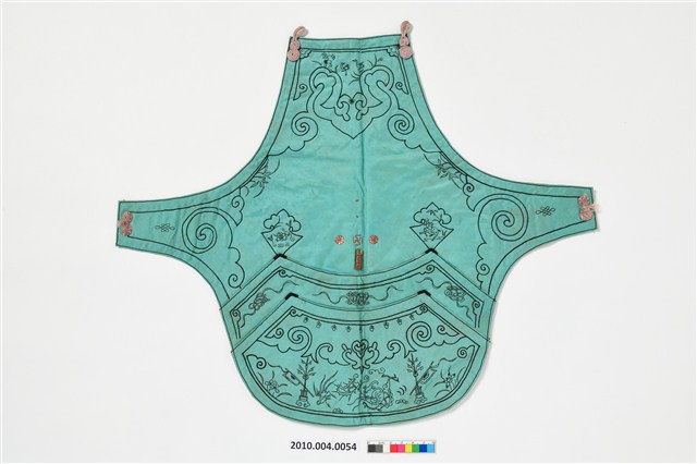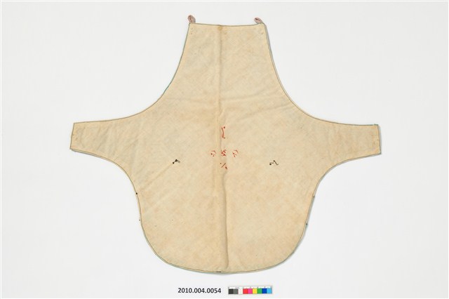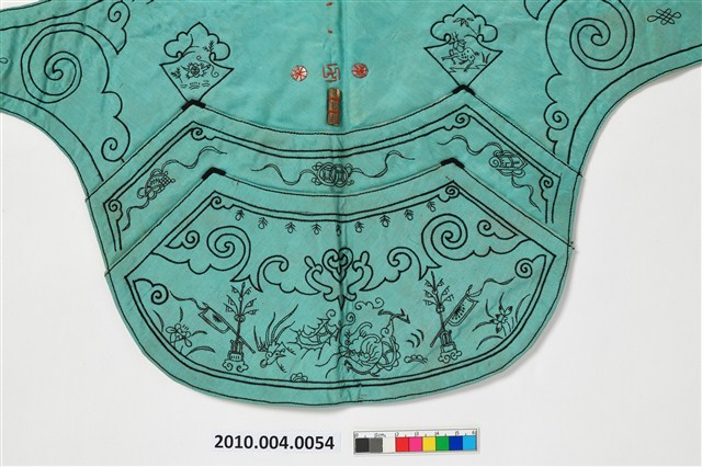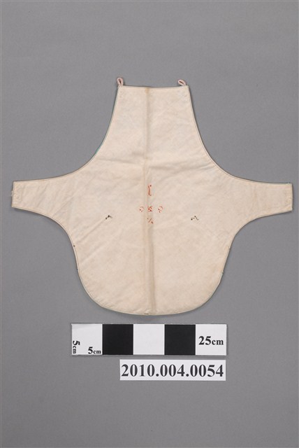1. 此件為下端略寬形肚兜,下端略窄、底部圓弧略平為新竹客家肚兜特色,正面為天藍色布,背面為米色棉布,可看出些許正面紋樣的繡線痕跡,無綁帶,外觀狀況良好。紋樣方面,以如意雲紋做邊框,繡有盤長紋、鈴蘭紋、器物紋,在圍腹上方兩側雲型框繡龜鹿紋,並且在肚兜中央縫有銀色釘片,展現此件肚兜的貴氣。2. 肚兜出現時間不會晚於漢代,隨時代形制、名稱均有改變,至清代開始稱作肚兜,臺灣也承襲此一名稱,別名還有抹胸、裹肚、兜兜等,雖然臺灣肚兜源自中國,但是臺灣肚兜通常先將紋樣繡於布片,再縫於肚兜上,裝飾安排上,紋樣多集中在下方口袋與緄邊,此兩點與中國地區肚兜有很大差別。另外,早期肚兜男女老幼都會使用,口袋部分有時會放置香料或藥材,可見肚兜還有香囊以及藥療的功能。