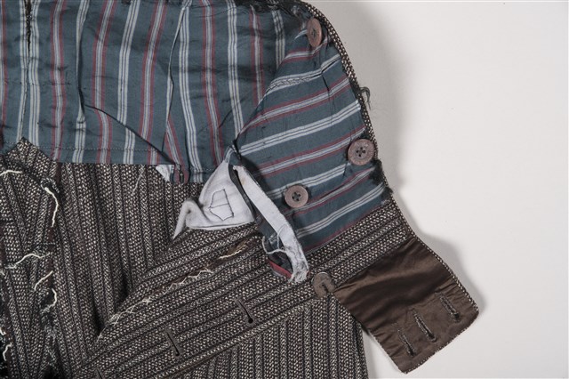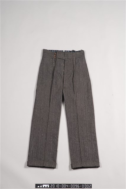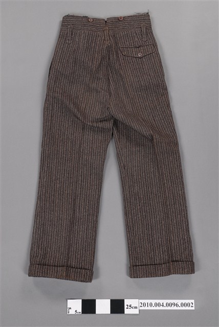 棕色條紋毛料男性西裝長褲,以棕色條紋毛料製作,前襠位置做開口縫三顆深灰色鈕釦,腰帶上也縫釦子做扣合。褲子前片左右各有一個脇口袋,左後片腰下製作一個加袋蓋的緄邊口袋。腰帶內層以黑色布料做裡襯(部分破損毛邊),褲腰帶上車縫有褲耳,腰帶後中心做成V字形叉口,可以增加腰圍尺寸的寬容量,同時在後腰帶上縫有二顆鈕釦用來掛吊帶。整件褲子以縫紉機車縫製作,褲口有反摺裝飾,做工細膩精緻,但從前襠開口未縫拉鍊而是以鈕釦處理的方式判斷,這件褲子應該被製作於1930年代之前。