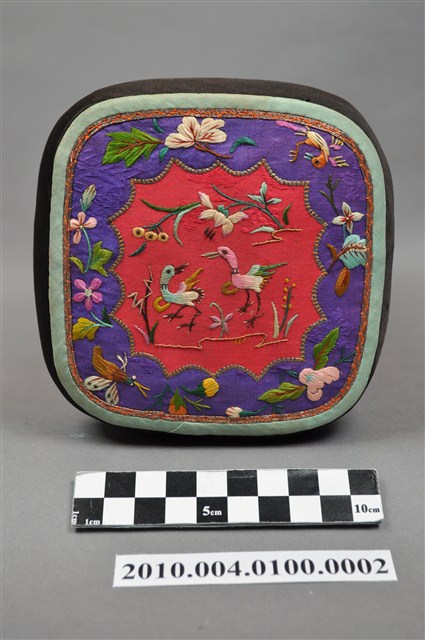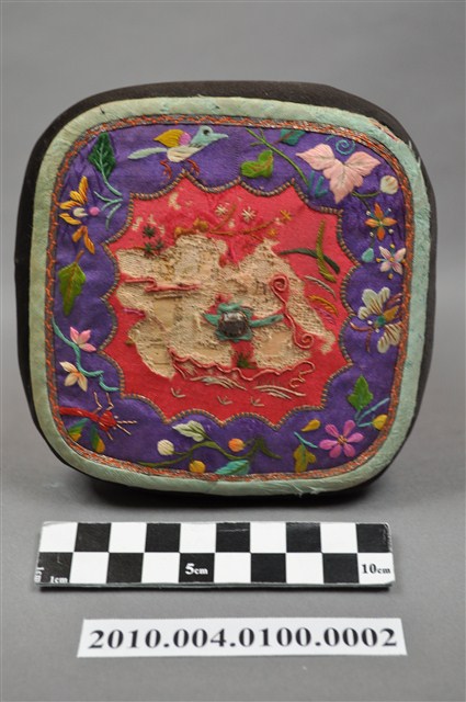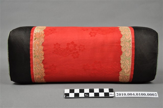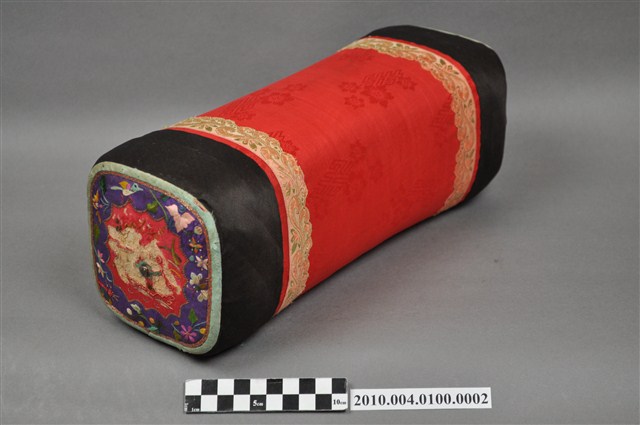 1.此為兩件一組的枕頭套組的大紅枕頭。大紅枕頭為略帶圓弧的長方型,枕身採用壽字紋提花布,靠近外側分別為纏枝花卉貼布以及黑色飾邊布,兩側繡片則以貼布挖雲裝飾花鳥紋。其中一側繡片為紫色布做貼布挖雲,中間繡紋磨損嚴重難以辨認,紫色布部分繡有蝴蝶、纏枝花卉。另一側繡片同樣以紫色布做貼布挖雲,中間紅布部份繡花鳥紋,紫布部分繡纏枝花卉、蝶紋。2.大紅枕頭為早期婚嫁常見的嫁妝。枕身通常不繡紋樣,而是繡在兩側繡片上,使用上較為舒適。