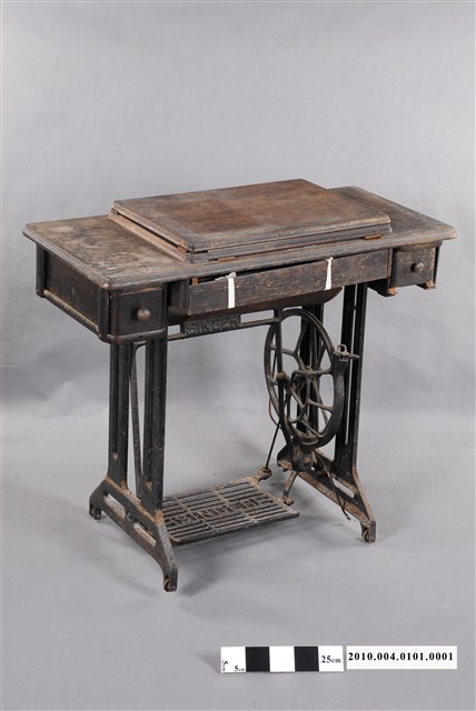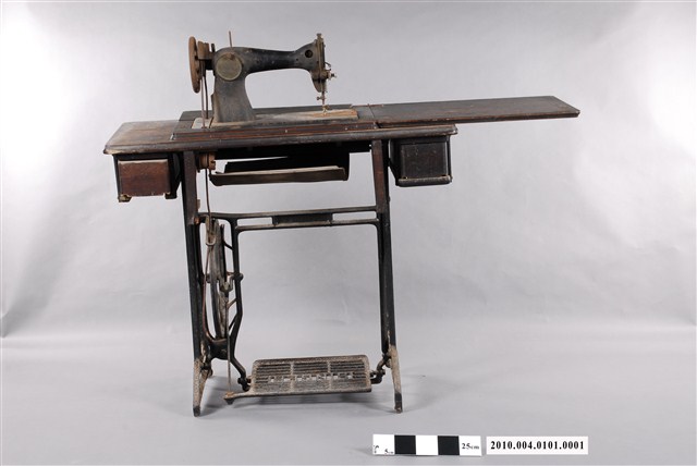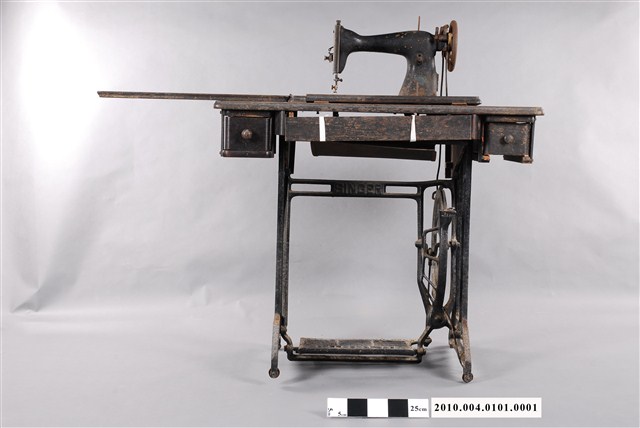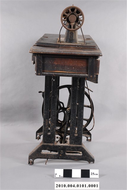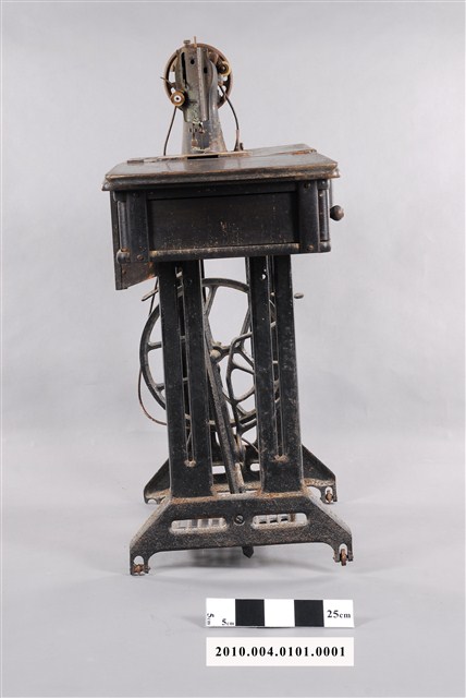 本文物為美國製勝家牌機械腳踏式縫紉機,機身底部鑄有「12 25043 MANCO」字樣,機身側邊近轉輪處,鑲有名牌,但因年代久遠已鏽蝕1/2以上,難以辨識其上字跡。 其有傳動輪、踏板,傳動橡皮條,但已老化斷裂,目前無法踩踏帶動轉動,踏板上有「SINGER」字樣。本件為鄭氏家族日本時代時購置,機械腳踏式縫紉機於當時十分稀少,須從美國進口,屬奢侈品,民國30餘年後戰爭爆發禁止輸入。Singer裁縫機為美國裁縫機製造商設計、製造,1855年開始向國際市場銷售裁縫機,後便在巴黎世界博覽會上獲獎。其行銷強調女性在其家庭中所扮演的角色,該才裁縫機則可以提升女性謙虛、奮鬥、美德等氣質。1790年英國人湯瑪斯‧聖特(Thomas Saint)為提高製鞋效率設計手搖裁縫機,在多次的改良之下,時至1853年多數家庭使用之腳踏裁縫機才出現。而傳統家庭中的縫紉工作多由女性擔任,因此縫紉機出現反映女性生活與科技互動,所產生工作型態之改變。