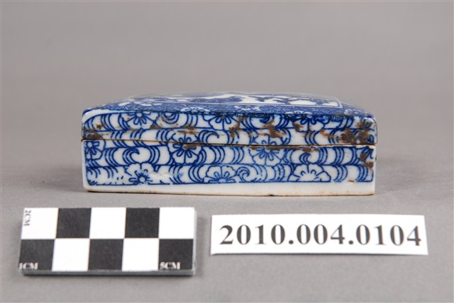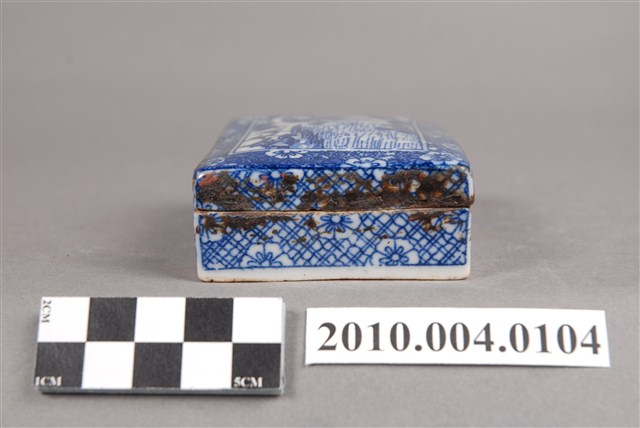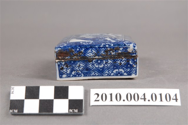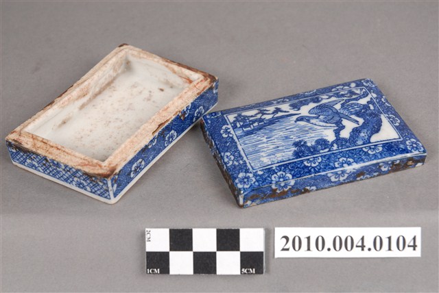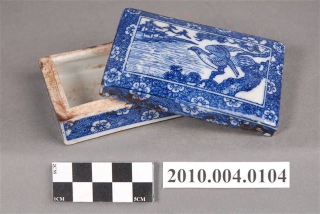 長方形印泥盒,分上蓋與盒身,蓋頂有青花老鷹、山水圖案,內盒印泥已取出,白色瓷胎。