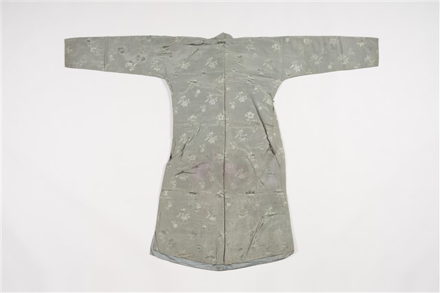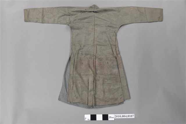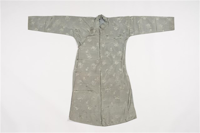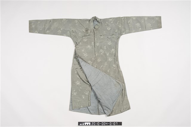 1.此服裝為雙層布料製作,表布為淺綠色絲質暗紋緹花布料,內裡是淺藍色布料,表布緹花為折枝花卉暗紋,服裝輪廓修長、袖管細窄,立領在頷下、大襟和脇邊有六對直布扣。衣身前後中心皆有剪接線, 加上內襟形成前後左右以及內襟,共有五襟齊長的「五世齊昌」美好寓意。立領的作法是先以本布鑲緄領緣後,再將立領綴縫上去,因此領子接縫處會出現如出芽的邊條。另外,領緣、大襟,均以本布做細窄的鑲緄收邊,細緻而優美。2.長袍在臺灣早期或稱為長衫,與馬褂合稱「長衫馬褂」或「長袍馬褂」,屬於男子的禮服之一,也是文人雅士較常穿著的服式,一般勞動者為了活動方便穿著短的對襟衫和大襠褲,教書先生、掌櫃、文職工作者則多以長袍為日常服飾穿著,此件長袍色彩淺淡,且從尺寸大小判斷,可能是男童穿用的袍服。