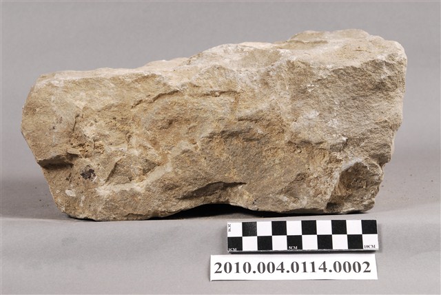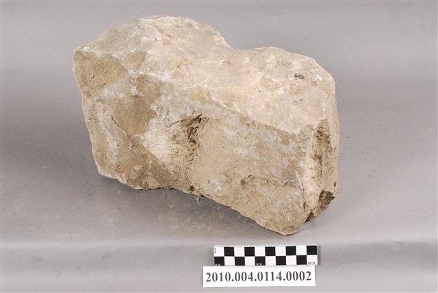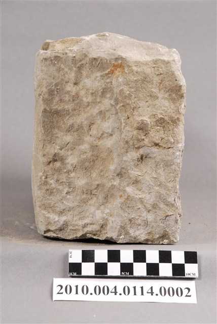 根據收藏來源資料,本文物疑為竹塹城石組2010.004.0114的一件,一組六件。竹塹城位於今新竹市,1828年到1829年改建為磚石城牆,城牆位置在今東門街、西門街、南門街、北門街。日本時代1906年起進行市區改正,將城牆陸續拆除成道路,城牆的磚石則用以築設下水道或作道路底面。本文物是位於北門街鄭用錫進士第前下水道邊的石塊。