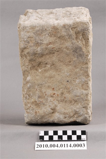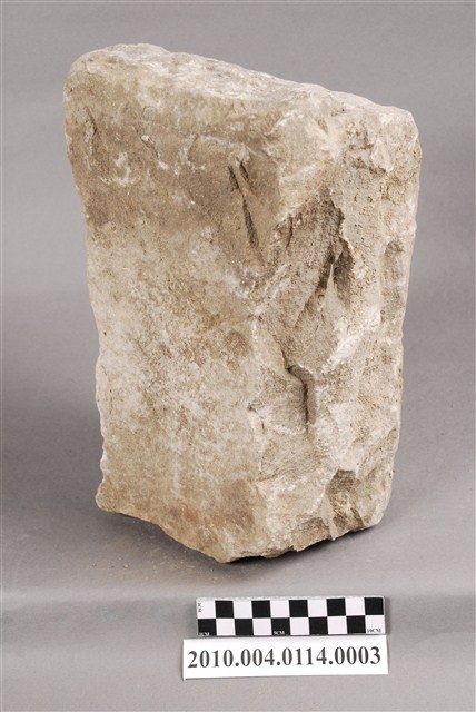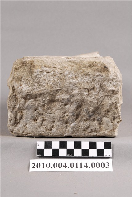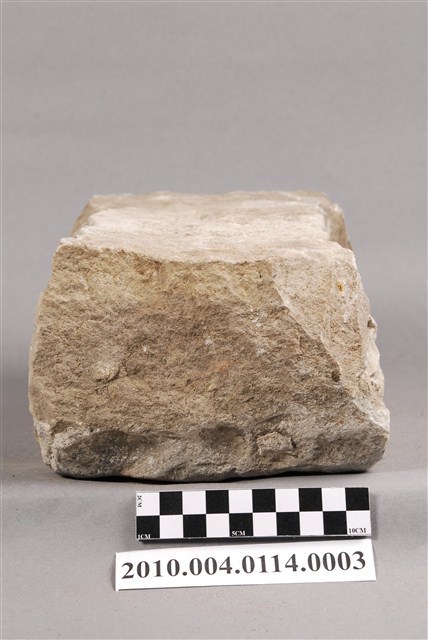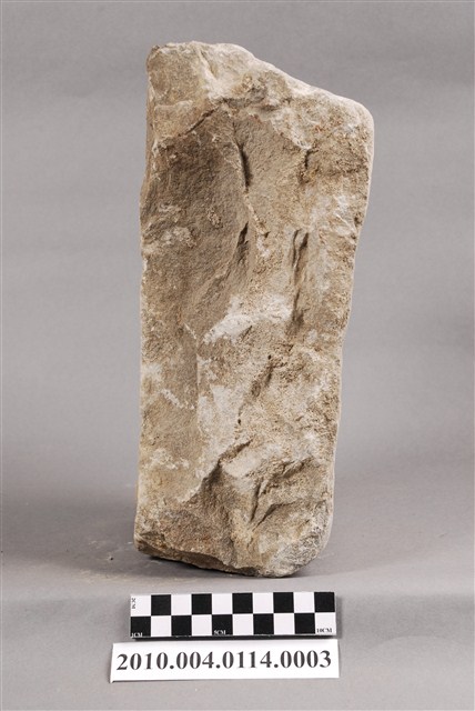 根據收藏來源資料,本文物疑為竹塹城石組2010.004.0114的一件,一組六件。竹塹城位於今新竹市,1828年到1829年改建為磚石城牆,城牆位置在今東門街、西門街、南門街、北門街。日本時代1906年起進行市區改正,將城牆陸續拆除成道路,城牆的磚石則用以築設下水道或作道路底面。本文物是位於北門街鄭用錫進士第前下水道邊的石塊。